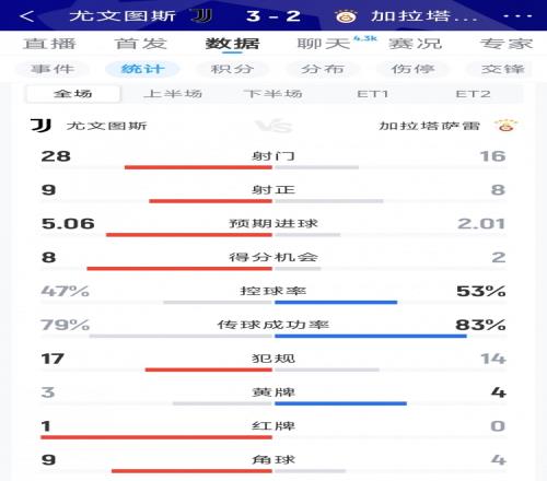 功虧一簣,尤文32加拉塔薩雷120分鐘數據:射門2916,射正98
