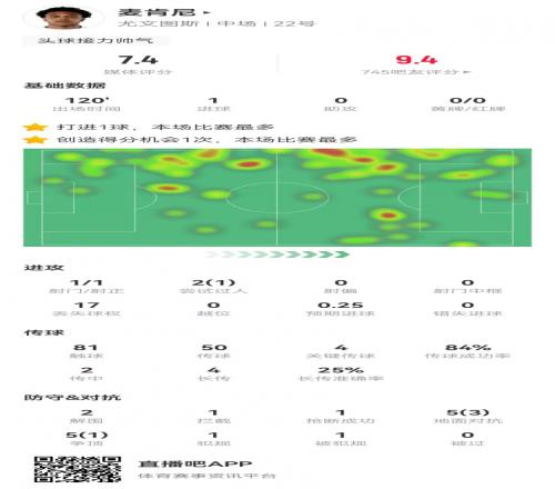 體育播報2月26日宣 尤文在本輪歐冠附加賽次回合3-2擊敗加拉塔薩雷,但總比分5-7被淘汰,麥肯尼本場數據如下: