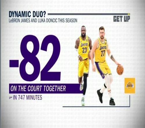 本賽季詹姆斯與東契奇747分鐘同場時間里凈負82分。