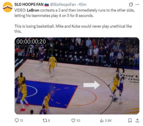 斯洛文尼亞的湖人球迷曬出了上半場詹姆斯的防守一幕,在詹姆斯防下杰倫-格林的三分出手后他就直接下快攻了,結果這個籃板被太陽拿到,詹姆斯并沒有回防。