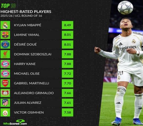 本賽季歐冠16強球員場均評分榜:姆巴佩居首,亞馬爾、杜埃前三