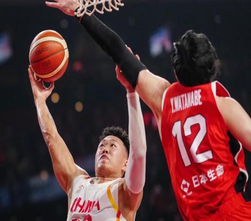 2月26日,中國隊球員廖三寧(右)在比賽中投籃。新華社記者 賈浩成 攝