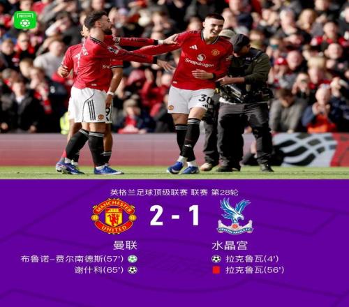 北京時間3月1日,英超聯賽第28輪,曼聯坐鎮主場迎戰水晶宮。上半場,拉克魯瓦開場4分鐘頭球破門,盧克-肖受傷被馬茲拉維換下,B費任意球攻門制造威脅;下半場,庫尼亞制造紅點套餐,拉克魯瓦送點又被罰下,B費點射扳平比分,隨后B費又助攻謝什科頭球破門完成反超。最終,曼聯2-1逆轉戰勝10人水晶宮。