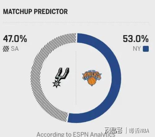 反觀尼克斯,上一場以127-98大勝雄鹿,近期整體發揮平穩。輸球場次里,僅一場不敵步行者,另外三場分別負于活塞(兩場)和騎士;贏球名單中則包括火箭、凱爾特人等強隊。球隊進攻依舊圍繞布倫森展開,今天對陣馬刺,能否贏下這場硬仗,關鍵要看布倫森和唐斯的發揮。賽前,美媒ESPN預測本場比賽,馬刺勝率47.0%,尼克斯勝率53.0%!
