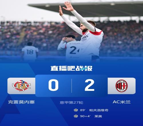 帕夫洛維奇、萊奧建功,米蘭2-0克雷莫內塞取得近3輪首勝,距榜首10分。