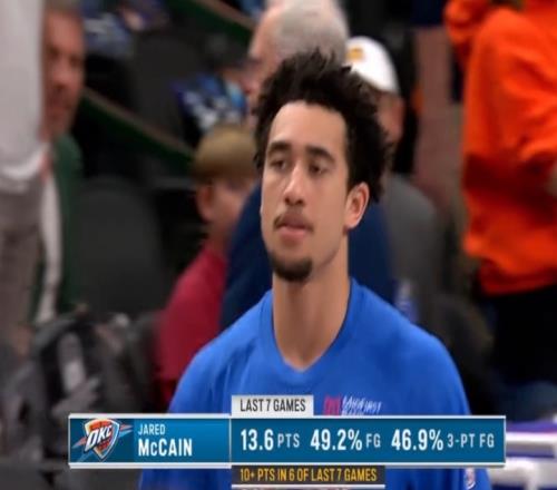 麥凱恩過去7場:場均13.6分,投籃命中率49.2%,三分命中率46.9%,6場得分上雙。
