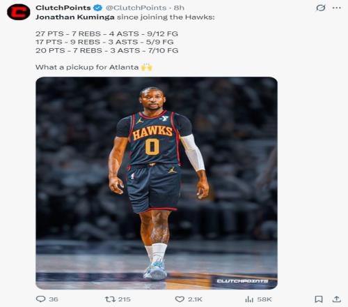 此役庫明加全場比賽25分鐘,10中7,三分2中1,罰球7中5,拿到20分7籃板3助攻2搶斷,命中率70%,三分命中率50%,真實命中率76.5%,正負值20+,他登場的三場比賽老鷹隊都拿到勝利。