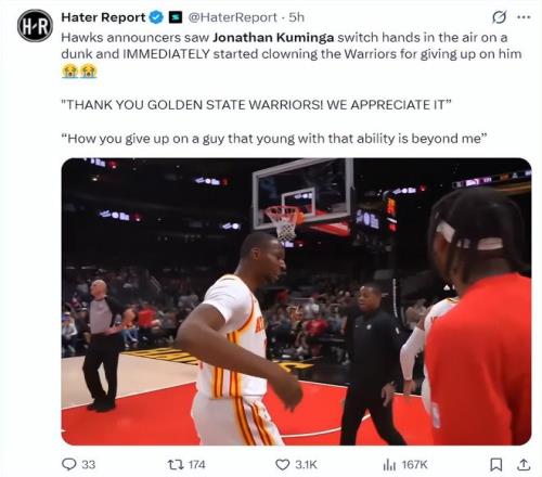 老鷹主場解說員在這場直播中嘲諷勇士隊:感謝金州勇士隊,我們深表感激,對于一個如此年輕且能力出眾的年輕球員,你們竟然選擇放棄,這簡直讓人難以理解。