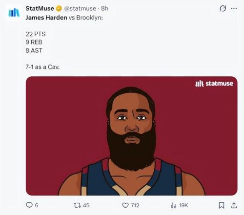 哈登加盟騎士后場(chǎng)均33分鐘,19.3分5.1籃板8助攻,命中率50%,三分命中率50%,罰球命中率81%,在他登場(chǎng)的比賽中騎士7勝1負(fù),哈登一下就成為了新的克村領(lǐng)頭羊。