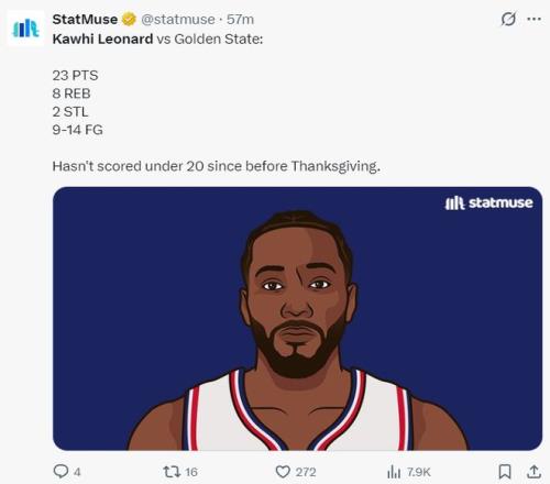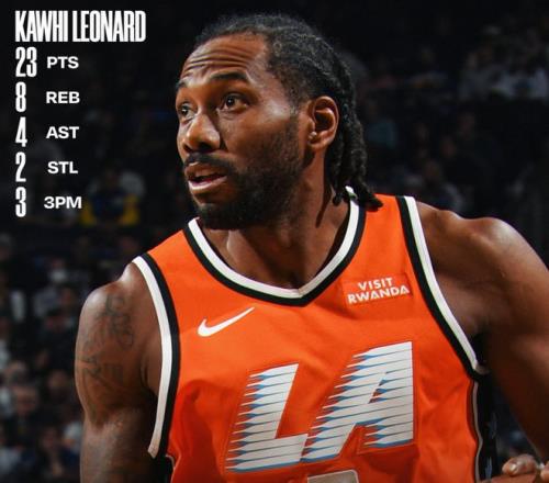 倫納德自感恩節后就沒有下過20+,本賽季的倫納德場均32.6分鐘,拿到27.8分6.3籃板3.7助攻2搶斷0.5蓋帽,命中率49.6%,三分命中率37.8%。