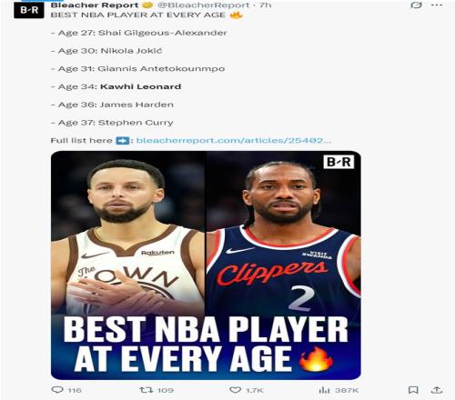 美媒BR也力挺現役最強34歲的球星是倫納德,現役最強37歲的球星是庫里而非杜蘭特。