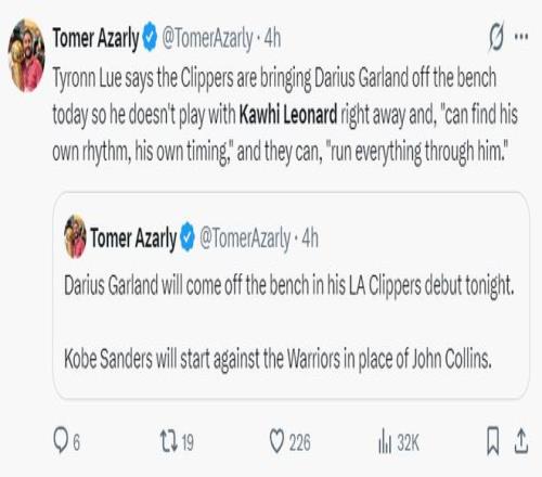 這場比賽之前泰倫盧表示,快船的新援加蘭會從替補席出發,他不會一出場就與倫納德搭檔,泰倫盧希望加蘭能夠在第二陣容掌控節奏與時機,希望加蘭通過組織進攻來幫助球隊。