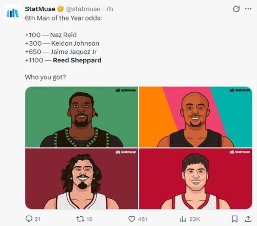 謝潑德也排在最佳第六人第四的位置,里德第一、凱爾登第二、小哈克斯第三、謝潑德第四。