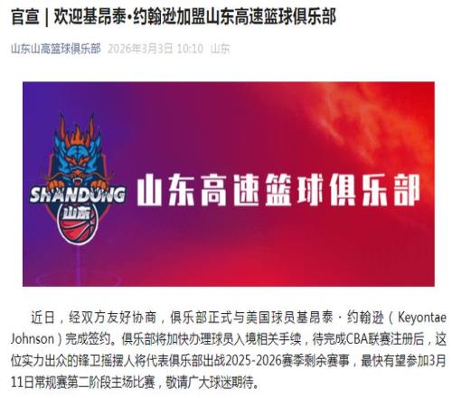 山東男籃官方公告寫道:“經(jīng)雙方友好協(xié)商,俱樂部正式與美國球員基昂泰-約翰遜完成簽約。俱樂部將加快辦理球員入境相關(guān)手續(xù),待完成CBA聯(lián)賽注冊后,這位實(shí)力出眾的鋒衛(wèi)搖擺人將代表俱樂部出戰(zhàn)2025-2026賽季剩余賽事,最快有望參加3月11日常規(guī)賽第二階段主場比賽,敬請廣大球迷期待。”