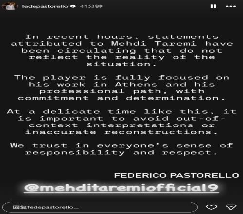 經紀人費德里科·帕斯托雷洛寫道:“近期流傳的關于邁赫迪·塔雷米的言論不符合實際情況。這位球員正以承諾與決心,完全專注于他在雅典的工作和他的職業道路。