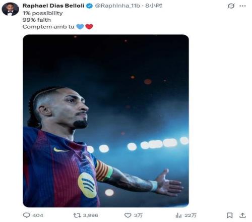 拉菲尼亞在社交平臺上曬出了這句話,并用加泰羅尼亞語補充道:“Comptem amb tu”(我們依靠你),這是對球迷的呼喚,希望他們成為第12名球員,助力巴薩實現逆轉。