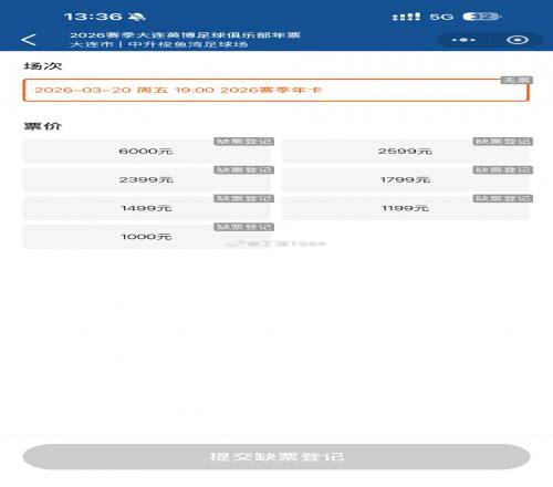 根據(jù)此前大連英博官方發(fā)布的票務(wù)公告,2026賽季新購年票選座、繳費時間為3月4日13:14至3月10日21:00,共有七個檔位:1000元、1199元、1499元、1799元、2399元、2599元(這六個檔位為普通年票)、6000元(商務(wù)年票)。球迷組織年票則分為749元和799元兩個檔位。