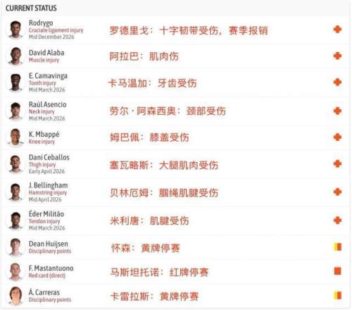 如果說巴薩傷病嚴(yán)重,那他們的競爭對手皇馬就是超級嚴(yán)重。周一晚主場0比1不敵赫塔費一役,懷森和卡雷拉斯均吃到黃牌停賽,馬斯坦托諾比賽結(jié)束前也拿到紅牌,可能停賽一到兩場。更嚴(yán)重的是帶傷堅持踢了幾十分鐘的羅德里戈賽后被診斷右膝十字韌帶和外側(cè)半月板受傷,不僅本賽季提前報銷,還無法參加今年世界杯。