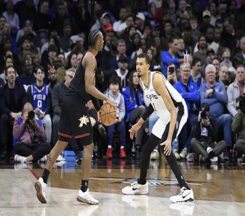 馬刺上一場(chǎng)客場(chǎng)89-114輸給尼克斯結(jié)束11連勝,76人上一場(chǎng)客場(chǎng)98-114輸給凱爾特人結(jié)束3連勝。本場(chǎng)76人缺少恩比德、烏布雷與喬治,馬刺缺少巴恩斯、加西亞與普拉姆利。首節(jié)馬刺用團(tuán)隊(duì)攻勢(shì)逐步壓制殘陣76人,首節(jié)馬刺22中11保持5成準(zhǔn)星,其中三分11中3,文班亞馬0出手僅借助罰球2中2,得到2分3籃板1助攻4蓋帽更多在防守端發(fā)揮威力,哈珀5中4得到11分與??怂?分5助攻。76人28中9,其中三分11中5,馬克西7中2得到8+5+2與埃奇庫(kù)姆6中1僅得到2分,首節(jié)比賽結(jié)束馬刺32-25領(lǐng)先76人。