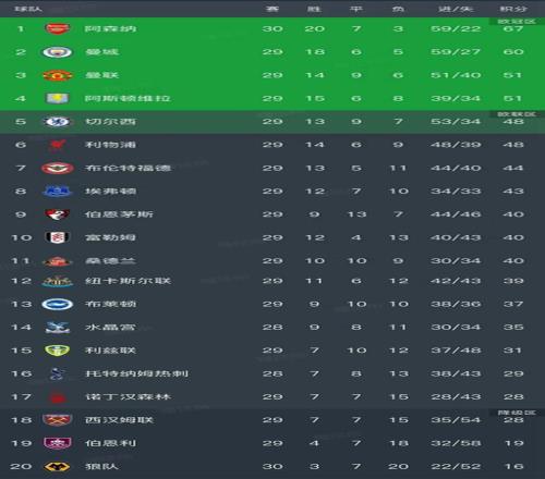 北京時(shí)間3月5日,今天凌晨英超第29輪又結(jié)束了5場比賽,我們看看最新排名!阿森納1-0小勝布萊頓,曼城2-2諾丁漢森林,曼聯(lián)1-2不敵紐卡斯?fàn)柭?lián),切爾西4-1大勝阿斯頓維拉,富勒姆0-1不敵西漢姆聯(lián)!