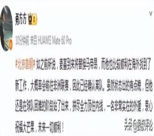 北京時間3月5日,根據媒體人“勇方方”的報道,麥基到來將替換馬帝昂,而他也比較順利在海外找到了新工作,大概率會前往非洲聯賽,因此已經確認離隊。雖然狀態出的有點晚,但他還是在球隊困難的階段站了出來,拼盡全力頂住內線,一名非常實在的外援,衷心祝福大芒果,未來一切順利! 。