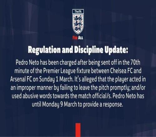 在3月1日進行的英超聯(lián)賽切爾西對陣阿森納的比賽中,佩德羅-內(nèi)托在第70分鐘被罰下場,據(jù)稱,球員被指控未能及時離場,行為不當(dāng),并且對比賽官員使用了辱罵性語言,他需在3月9日之前作出回應(yīng)。