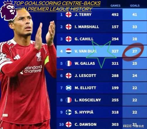 英超后衛(wèi)進(jìn)球榜:范戴克上升至歷史第二(不包括點(diǎn)球)