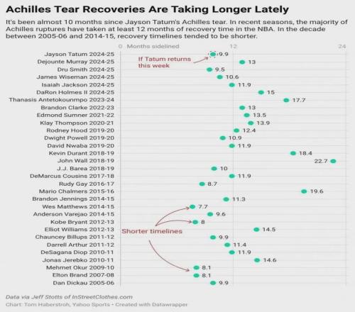 雅虎體育曬出了一組反直覺的數據:NBA球員在遭遇跟腱撕裂后,歷史上的平均恢復周期大約為10個月。2005年至2014年這一階段,不少球員甚至可以在8個月內復出。