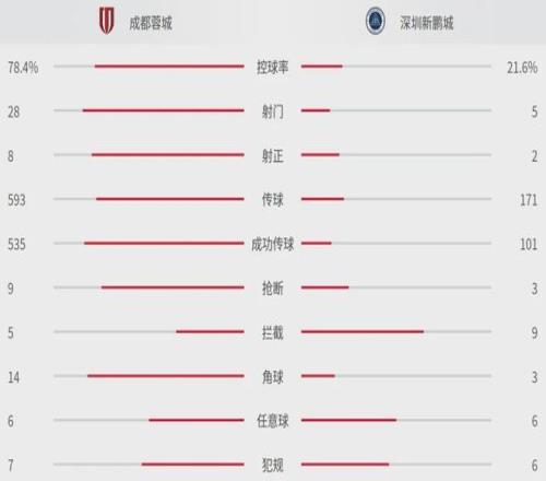 本場比賽,多打1人的成都蓉城可以說是完全掌控比賽,拿到78.4%的控球率,創造了14個角球,28腳射門,其中8腳射正斬獲5球。