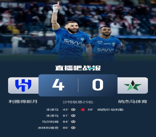 體育播報3月7日宣 北京時間3月7日凌晨3時整,2025-26賽季沙特聯第25輪在法赫德國王國際體育場展開角逐,利雅得新月主場迎戰納杰馬體育。上半場多薩里造紅牌,本澤馬首開記錄,下半場本澤馬再入一球,馬爾科姆和米林科維奇破門。最終利雅得新月主場4-0大勝十人納杰馬體育,新月取得聯賽兩連勝+25輪不敗,先賽積61分追平利雅得勝利,暫居第3名。