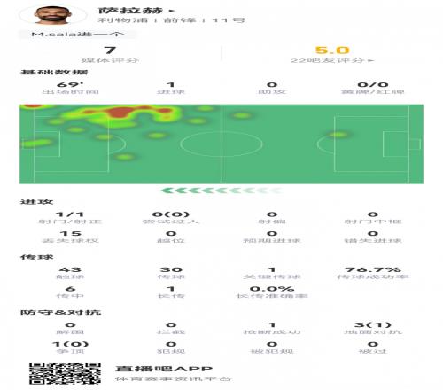 薩拉赫全場數據:1射1正1進球1關鍵傳球,15次丟失球權,評分7