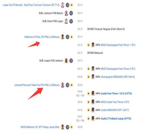 終場前8秒尚帕尼傳給卡斯爾后,倫納德只能對卡斯爾犯規,卡斯爾兩罰一中,終場前3秒卡斯爾補籃命中直接鎖定勝局,倫納德在這決勝15秒只貢獻了一個犯規。
