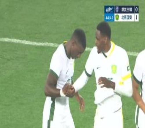第45分鐘,王剛右路底線位置無(wú)人盯防的傳中,禁區(qū)內(nèi)法比奧頭槌破門!北京國(guó)安1-0領(lǐng)先武漢三鎮(zhèn)↓