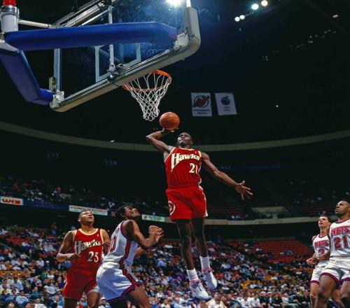 1982年選秀大會,威爾金斯在第三順位被猶他爵士選中,隨即被交易到老鷹,開啟了一段傳奇。新秀賽季他場均17.5分,第二個賽季漲到21.6分,從此連續(xù)11個賽季場均得分超過20分。1985-86賽季,他以場均30.3分拿下得分王;1986年扣籃大賽,他用一記大風(fēng)車掄臂扣驚艷全場;1988年季后賽,他率領(lǐng)老鷹和拉里-伯德的凱爾特人鏖戰(zhàn)七場,最終以兩分之差落敗,但憑借場均31.3分的表現(xiàn)贏得了所有人的尊重。