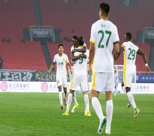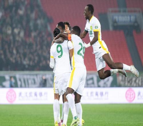 3月8日,北京國安隊球員張玉寧(左一)進球后與隊友慶祝。新華社記者 肖藝九 攝