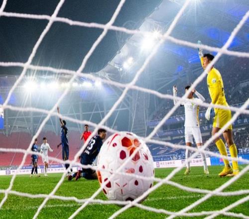 3月8日,武漢三鎮(zhèn)隊守門員方鏡淇(右)向裁判示意越位,最后進球被判無效。新華社記者 肖藝九 攝
