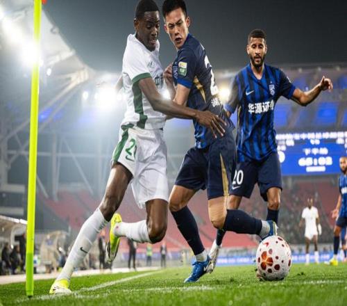 3月8日,武漢三鎮(zhèn)隊球員明天(左)與北京國安隊球員鄧捷夫在比賽中拼搶。新華社記者 肖藝九 攝