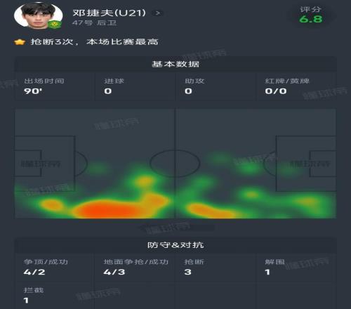 第一個,能被國安新任主帥、上賽季英超熱刺助教蒙哥馬利第一場就安排首發(fā),果然是有點東西的。鄧捷夫今晚中超首發(fā)并踢滿全場,3次搶斷全場最高,還有1次解圍,1次攔截,3次地面爭搶成功和2次爭頂成功,這數(shù)據(jù)對于18歲小將的首秀簡直是驚艷了!