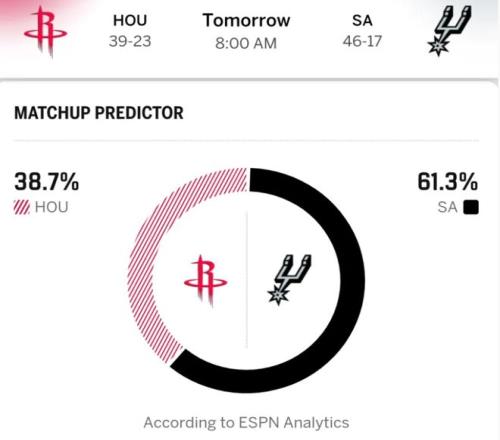 火箭雖在上場(chǎng)勝開拓者時(shí),解鎖阿門與申京拆分使用、謝潑德打組織的高效戰(zhàn)術(shù),但烏度卡此役延續(xù)常規(guī)首發(fā),史密斯、杜蘭特、申京、伊森、阿門,陣容兼容問(wèn)題再度備受考驗(yàn)。烏度卡如何調(diào)整去削弱文班的壓制力,成為火箭取勝關(guān)鍵,整體來(lái)看馬刺實(shí)力更占優(yōu)。賽前,ESPN勝率預(yù)測(cè):火箭贏球概率低至38.7%,馬刺贏球概率則到達(dá)61.3%!
