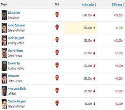 阿森納球員身價變化: