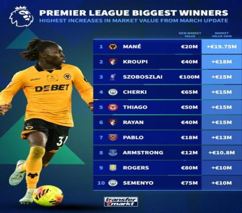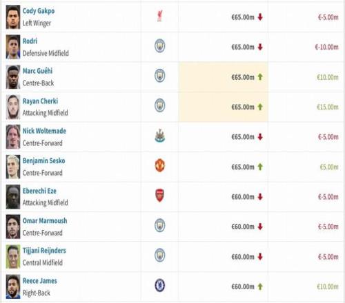 英超球員身價變更情況