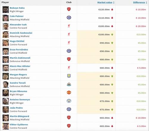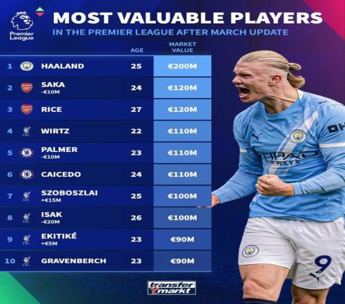 3月9日,英超球員身價更新,薩卡降至1.2億歐,帕爾默降至1億歐,索博漲至1億歐,伊薩克下跌2000萬歐,身價來到1億歐。