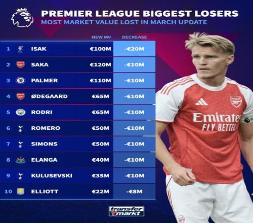 北京時(shí)間3月9日,德轉(zhuǎn)更新英超身價(jià)。其中伊薩克下跌2000萬歐來到1億歐元,薩卡、帕爾默、厄德高、羅德里各下跌1000萬歐。