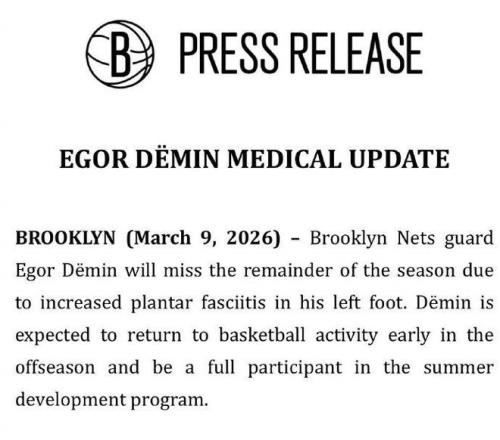 北京時間3月10日,籃網官宣新科8號秀杰明因左腳足底筋膜炎傷勢加重,將缺席本賽季剩余比賽提前賽季報銷,他本賽季曾經連續34場比賽命中三分,創造NBA歷史新秀第一紀錄。