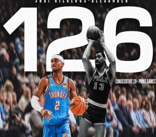 中段亞歷山大和杰林帶隊拉開10分分差,穆雷跳投終于止血。但后半段亞歷山大頂著布勞恩上籃又將掘金打停。小哈達威連中三分,戈登和約基奇連續罰球,伊塞亞喬命中壓哨三分球,半場雷霆66-60領先掘金。進入下半場,杰林再中三分,掘金這邊卡梅倫約翰遜手指受傷回更衣室。伊塞亞喬和小哈達威外線對狙,在約基奇帶領下,掘金再度反超比分。中段亞歷山大單打+喂餅華萊士,杰林把握住空位三分球機會,約基奇則利用錯位優勢上分,雙方比分交替上升。節末亞歷山大撤步三分命中,連續126場得分20+,追平張伯倫!