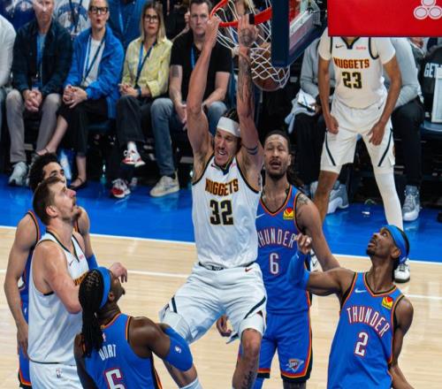 開場約基奇就連續拋投,杰林從對抗到身高,確實防不了。亞歷山大和杰林內外開花,戈登內突外投,雷霆完全攔不住,打了4分鐘,戈登獨砍13分,打停雷霆!暫停回來穆雷跳投續上火力,戈登連續造殺傷,雷霆陣地戰防守太吃力了。掘金最多拉開13分分差,多特三分止血后,后半段亞歷山大帶著替補席的米切爾和肯威開始反撲。節末杰林和小哈達威對轟三分球,米切爾連續單打,第一節打完,掘金40-37雷霆。進入第二節,多特三分追平后,瓦蘭勾手打進,此后伊塞亞喬和米切爾下三分雨,掘金替補一直輸分。