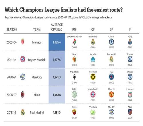 此外,皇家馬德里2015-16賽季的奪冠之路被評為第五輕松的,他們在決賽中以4-1擊敗同城對手馬德里競技。他們晉級決賽的道路——不包括決賽本身——被評為最有利的,先后遇到了羅馬、沃爾夫斯堡,以及在曼努埃爾-佩萊格里尼執教最后賽季、最終排名英超第四的曼城。