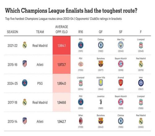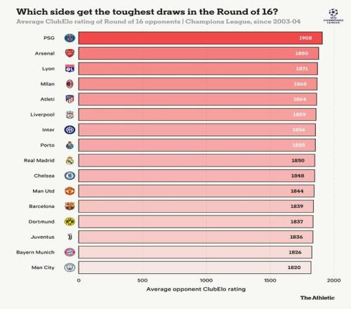 在所有參加過10次或以上16強比賽的球隊中,根據對手的ClubElo評分,只有巴黎圣日耳曼平均遭遇的對手比阿森納更強。