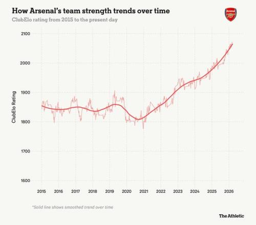 盡管并非完美無缺,但該系統目前將阿森納評為世界最佳球隊——鑒于他們本賽季在阿爾特塔執教下國內外賽場的表現,這個地位很難反駁。下圖展示了自他執教以來球隊的迅速崛起。