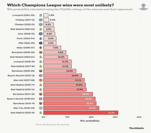 根據他們當時以及對手的ClubElo評分,他們奪冠的概率不到2%。切爾西在2012年的首座歐冠冠軍同樣出人意料,他們在半決賽和決賽中分別戰勝了強大的巴塞羅那和拜仁慕尼黑。